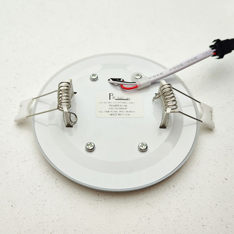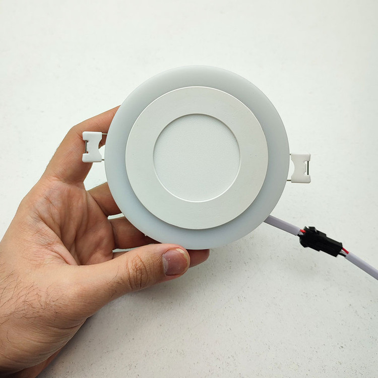 پنل ال ای دی توکار مدل سه حالته 3+3 وات یکی از بهترین محصولات جدید هالوژنی جهت جایگزینی با انواع قدیمی آن است. نحوه کارکرد این پنل SMD فوق کم مصرف به این حالت است که با هر بار خاموش و روشن کردن کلید روشنایی حالت های نور دهی آن تغییر خواهد کرد و بارزترین ویژگی این پنل خوش ساخت نور رنگی دور آن می باشد که در زمان قرار گیری در حالت دوم فقط این نور روشن خواهد شد و حالت نور خواب ملایم به فضای شما هدیه خواهد داد که جایگزین بسیار مناسبی برای نورهای مخفی می باشد و می توانید آن را در شب روشن کرده و از نور یکپارچه آن لذت ببرید. قسمت میانی این چراغ از پنل اج لایت بهره میبرد که نوری یک دست با پوشش دهی بالا را به ارمغان می آورد و ترکیب آن با نور آبی حلقه ای رنگ دورش بسیار زیبا و منحصر به فرد می باشد. استفاده از تکنولوژی SMD در پنل سقفی دور رنگی باعث افزایش طول عمر و بهرهوری پنلها میگردد. پنل سه حالته با قابلیت ایجاد نور در سه حالت، نوری دلپذیر و زیبایی را برای شما به ارمغان میآورد. این پنل سه حالته LED ، با طراحی جدید و کیفیت بالا از یک سو قابلیت تامین روشنایی در حالت عمومی و از سوی دیگر قابلیت روشنایی تزیینی را دارد. پنل سه حالته دارای رنگ ” مهتابی” در داخل و چهار رنگ آبی در اطراف آنها میباشند که قابلیت انتخاب این دو رنگ در سه حالت امکانپذیر میباشد. (داخل روشن، بیرون خاموش – بیرون روشن، داخل خاموش – هردو روشن) که با هر بار خاموش و روشن کردن حالت آن عوض خواهد شد.