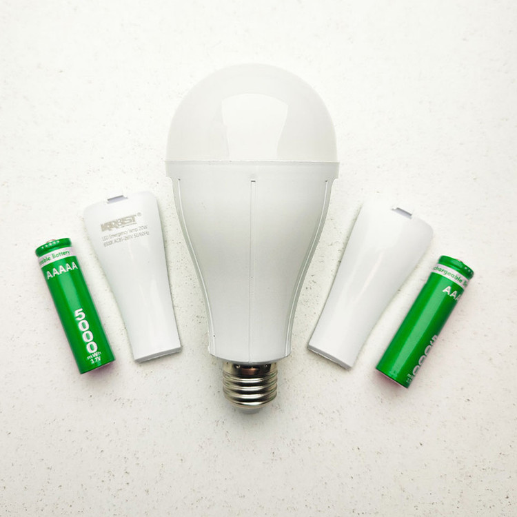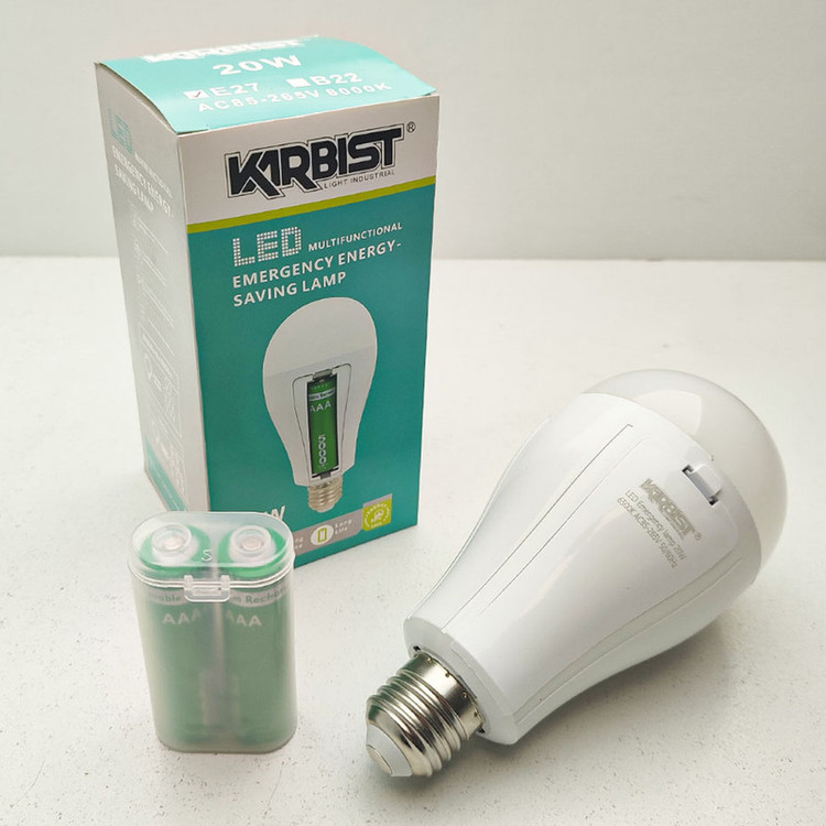 لامپ شارژی دوحالته که به سرپیچ وصل میشود و در حالت عادی یعنی وصل بودن برق شهری با ولتاژ 220 ولت و توان حدود 20 وات روشنایی دارد اما با قطع شدن برق از سمت اداره برق به صورت اتوماتیک بر روی حالت دوم میرود و توسط باتری داخلی لیتیوم یون توان 6 وات روشن میشود. در واقع این لامپ دارای یک چیپ دو حالته اتوماتیک است که هم ورودی 220 را دارا بوده و هم ورودی باتری لیتیوم یون 2000 میلی آمپر که زمانی که لامپ با برق شهری روشن هستند باتری ها شارژ میشوند و در زمان قطعی برق به صورت لحظه ای باتری ها وارد مدار شده و لامپ با توان کمتر یعنی 6 وات روشن میشود. همچنین با دارا بودن 2 باتری با ظرفیت 2000 میلی آمپر تا 4 ساعت روشنایی اضطراری در زمان قطعی برق برای شما دارد. اما نکته مهم این است که حالت اضطراری این لامپ، با خاموش کردن بوسیله کلید فعال نمی شود (به استثناء کلیدهای چراغ دار که در صورت نیاز میتوانید چراغ کلید را حذف نمایید) و فقط با قطع شدن برق شهری فعال میشود.