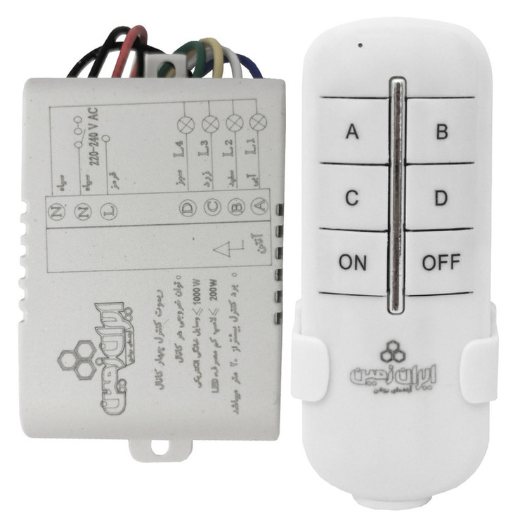 ریموت کنترل 4 کانال با خروجی 220 ولت مناسب برای خاموش و روشن نمودن انواع وسایل برقی مانند لامپ و لوستر است . این محصول دارای یک گیرنده است که تا 1000 وات برای وسایل خانگی الکتریکی و تا 200 وات برای لامپ های ال ای دی و کم مصرف قابل استفاده می باشد . طریقه نصب محصول مطابق نقشه ای که بر روی گیرنده ها قرار دارد می باشد .جهت راه اندازی و اتصال آن به سیستم روشنایی می بایست سیم های ورودی قرمز و مشکی به برق شهری متصل نموده و سیم های رنگی را به لامپها متصل نمایید و در نهایت سیم مشکی را به سر مشترک لامپ ها اتصال دهید.