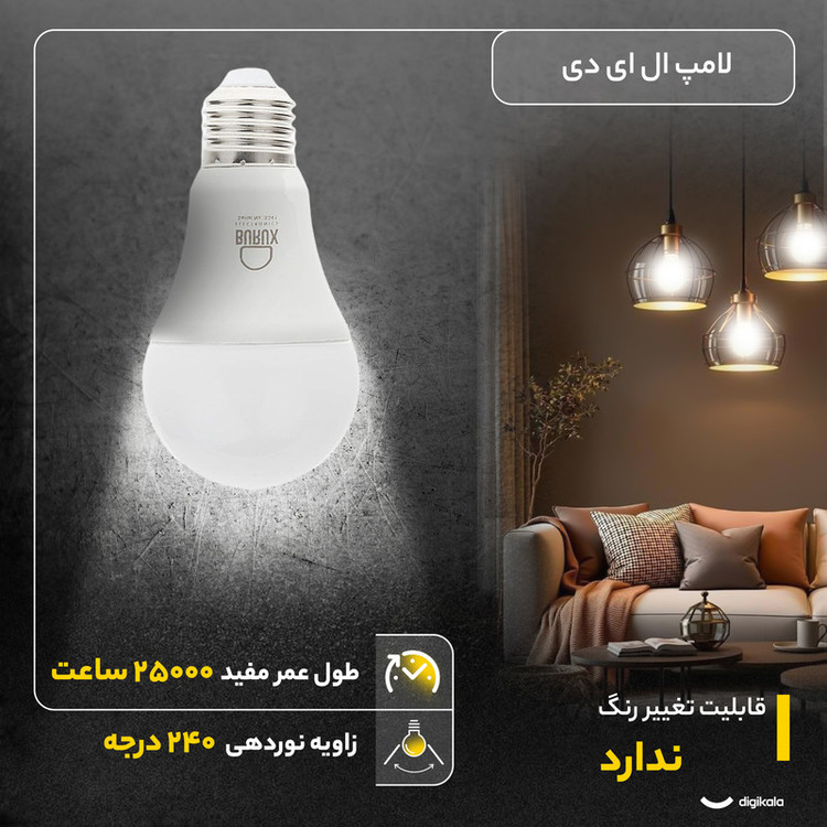 لامپ الایدی 12 وات مدل «A60-PAIC» با پایهی E27 از محصولات شرکت «بروکس» (Burux) است که با قدرت نوردهی بالا و زاویهی نوردهی بسیار عالی، میتواند یکی از برترین گزینهها برای جایگزینی لامپهای معمولی و حتی کممصرف باشد. نورپردازی و انتخاب بهترین تجهیزات روشنایی همواره به اندازهی دکوراسیون و حتی معماری موردتوجه بوده است. آنچه اکنون بیشازپیش اهمیت یافته، استفاده از لامپ و تجهیزاتی است که بیشترین بازده یا نوردهی را در کنار مصرف انرژی و هزینههایی پایینتر برای مصرفکننده به همراه داشته باشد. اینکه لامپهای الایدی دستکم از نظر روشنایی و مصرف، یکی از بهترین گزینهها در خصوص روشنایی به شمار میروند، انکارناپذیر است. لامپ الایدی 12 وات بروکس مدل A60-PAIC با پایهی E27 میتواند تمامی انتظارات ذکرشده را البته بدون مضرات جانبی برای کاربران برآورده سازد. همچنین با توجه به پایه و زاویهی خیلی خوب نوردهی، میتوان آن را بهعنوان یکی از منابع اصلی نور یا نورپردازی و از اولین گزینهها هم در منازل و هم در سالنها یا اماکن تجاری به شمار آورد. گفتنی است قدرت نوردهی این لامپ با نوردهی یک عدد لامپ 75 وات رشتهای برابری میکند و از ردهی انرژی مناسبی نیز برخوردار است. محصولات متنوع نور و روشنایی بروکس از تولیداتی هستند که از نیمقرن تجربهی گروه LiteLux بهره میبرند و صرفهجویی در هزینه و مصرف انرژی را برای مصرفکنندگان خود به همراه دارند. از مشخصات بارز محصولات بروکس، میتوان به طولعمر بالا، مصرف انرژی پایین و همچنین منتشرنکردن هرگونه پرتوی خطرناک اشاره کرد.